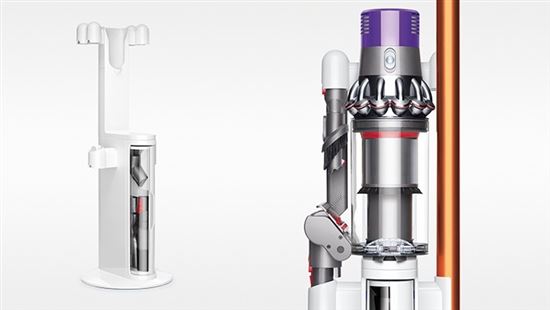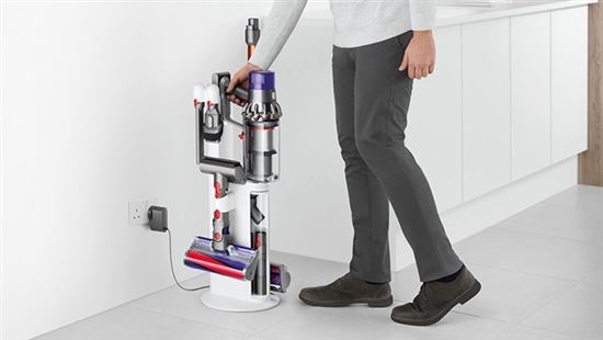 Uložení na podlaze - pro dobíjení není nutné připevnit stanici ke zdi. Navrženo pro optimalizaci úložného prostoru pro vysavač Dyson Cyclone V10™ a jeho příslušenství. Umožňuje snadný přístup k příslušenství během úklidu