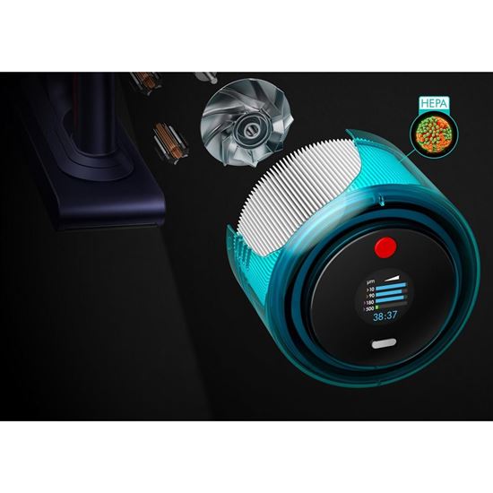 Pokročilý sací výkon¹ a pokročilá filtrace HEPA s detekcí prachu a vědeckým důkazem na obrazovce.