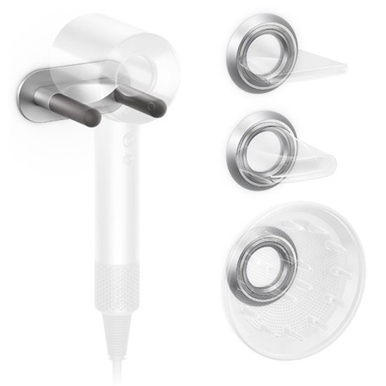 Stylový úchyt na stěnu a navržený pro profesionální vysoušeč vlasů Dyson Supersonic™ a jeho příslušenství.