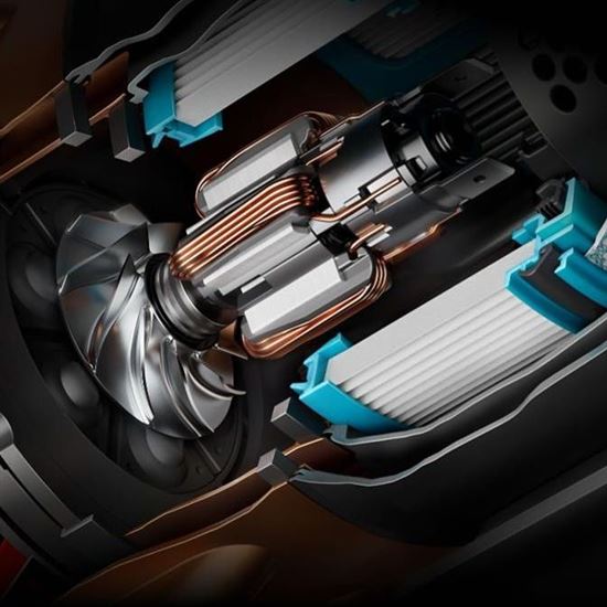 Pro vyšší účinnost pohání jediný ve středu hubice umístěný 100wattový bezkomutátorový stejnosměrný motor oba kónické kartáče současně.