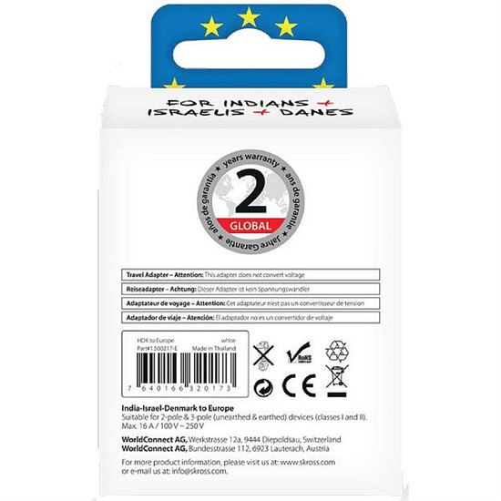 Spolehlivé připojení na cestách Adaptér SKROSS India-Israel-Denmark to Europe umožňuje bezpečné použití zařízení ze zemí Indie, Izrael a Dánsko v českých a evropských zásuvkách typů E a F. Připojí uzemněné i neuzemněné vidlice přívodních kabelů, bez problémů zapojíte vše od notebooků, telefonů až po fény.