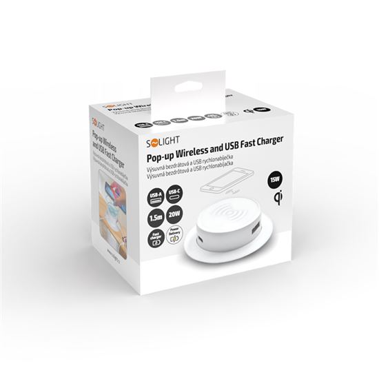 • Solight bezdrátová 15W + USB A+C 20W PD výsuvná nabíječka, bílá