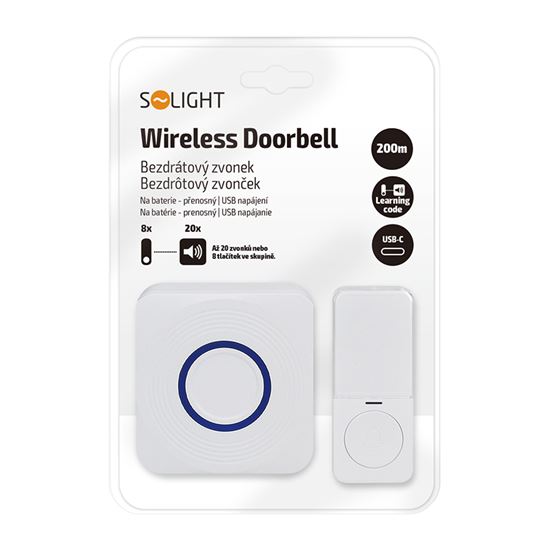 • Solight bezdrátový zvonek, bateriový + USB, 200m, bílý, learning code