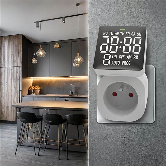 Tento časovač je vybaven inverzním LCD displejem s velkými znaky a úhlopříčkou 7 cm, který lze natočit pro lepší čitelnost. Nabízí 8 denních spínacích cyklů a 15 skupin pro nastavení různých dní. Disponuje dětskými pojistkami, pamětí pro uchování nastavených hodnot a možností vypnutí displeje. Přesnost nastavení je 1 minuta, provozní teplota -10°C až +40°C. Napájení 230V/16A (3680W).