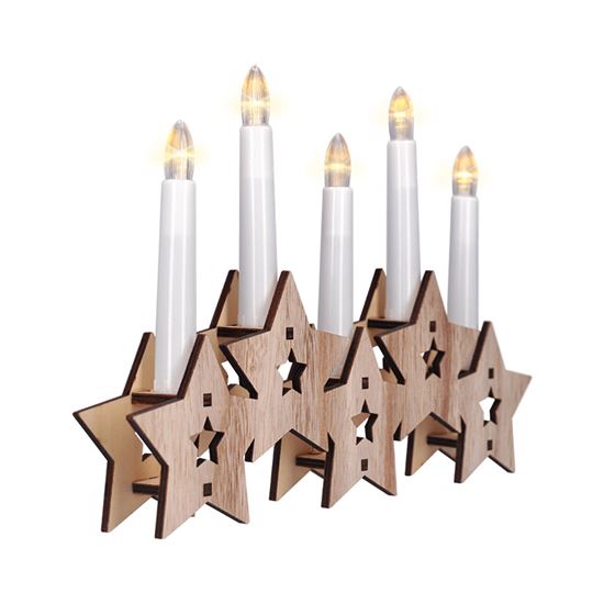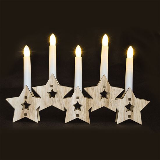 Dřevěný svícen s pěti svícemi a LED diodami v teplé bílé barvě je stylovou reinterpretací klasického adventního svícnu. Vyroben z přírodního dřeva, kombinuje tradiční vzhled s moderní technologií. Dekor hvězd dodává svícnu šmrnc a současně decentní eleganci. Rozměry 30 × 20 × 3,5 cm jej předurčují jako dominantní dekoraci na parapet či komodu.