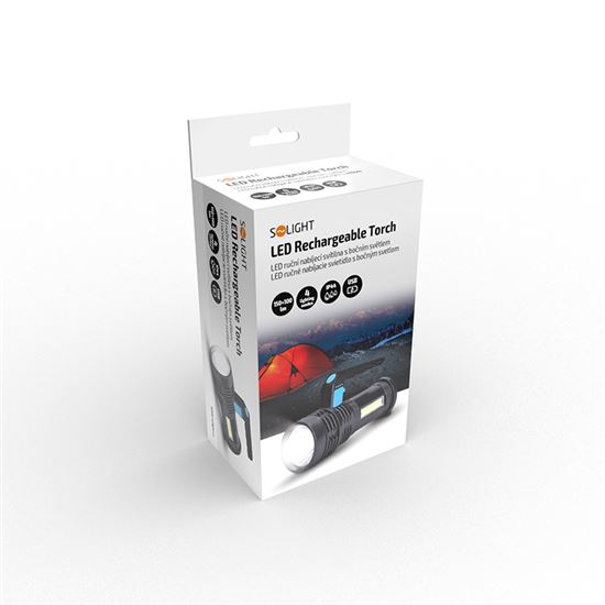 Praktická ruční LED svítilna s předním 3W SMD a bočním 3W COB světlem poskytuje kombinovaný světelný tok až 150 +100 lm. Nabízí čtyři režimy – přední LED 100 %, 50 %, blikání a boční LED 100 %. Li-Ion akumulátor 800 mAh zajišťuje výdrž 2–4 hodiny, nabíjí se přes USB kabel (v balení) a dobití trvá cca 4 hodiny. Odolná proti vlhkosti (IP44), vhodná do exteriéru. Svítilna má rozměry 150 x 54 x 95 mm, indikátor stavu baterie a praktický design v černém provedení. Všestranný pomocník na chatu, do dílny i na cesty.
