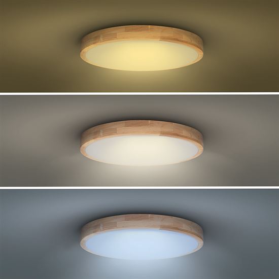 Solid Oak ve verzi 60 W je určen pro ty, kteří potřebují silnější světelný výkon – až 4200 lm při neutrální bílé (4000K). Teplotu světla lze přepínat mezi 3000K, 4000K a 6500K, a světlo plynule stmívat podle nálady nebo denní doby. Ovládání je zajištěno dálkovým ovladačem, který je součástí balení.