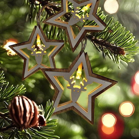 Kouzelný vánoční řetěz s dřevěnými hvězdami dodá vašemu interiéru přírodní a rustikální atmosféru. Na délce 1,5 metru je rozmístěno 10 LED diod, které jemným teple bílým světlem rozsvěcují vyřezávané dřevěné hvězdy. Jednoduchý design v kombinaci se světlem zajišťuje decentní, ale efektní dekoraci například na okenní parapet, stěnu nebo poličku.