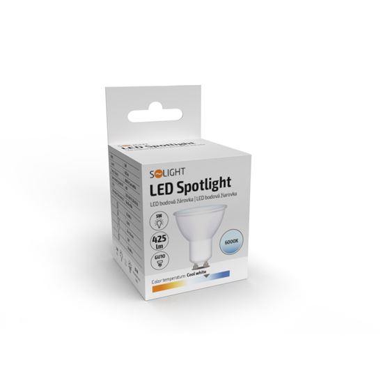 LED bodová žárovka GU10 s chladně bílým světlem (6000K) nabízí intenzivní osvětlení pro pracovní a funkční prostory. S výkonem 5W a světelným tokem 425 lm se hodí do kuchyní, koupelen, kanceláří či dílen.