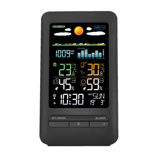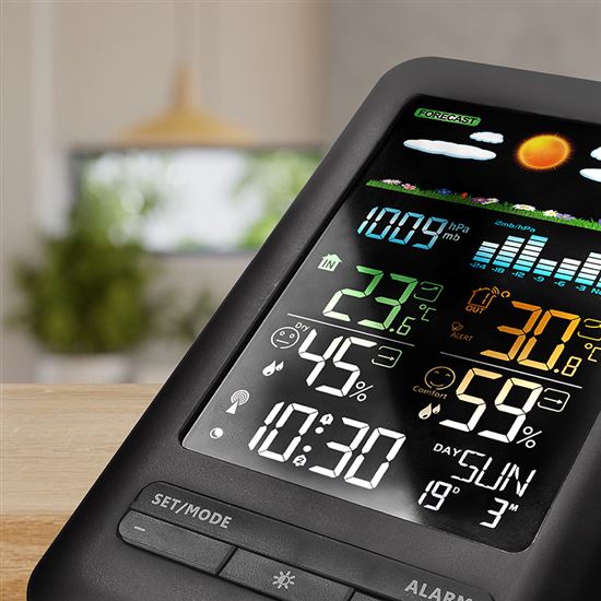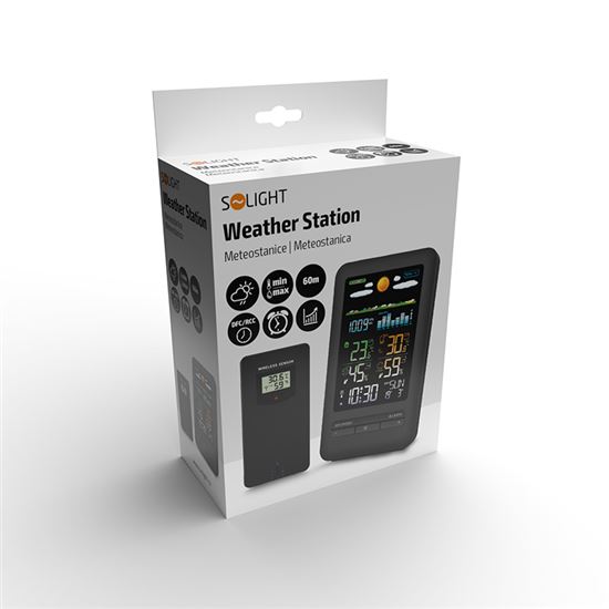 MeteostaniceTato meteostanice nabízí rádiově řízené hodiny DCF, kalendář do roku 2099 a zobrazení dnů v týdnu ve 4 jazycích (CZ, EN, DE, HU). Umožňuje formát času 12/24h, má budík s automatickým odložením buzení a měří barometrický tlak (600–1100 hPa), vnitřní a vnější vlhkost (20–95 % RH) a teplotu (-9,9 °C až 50 °C vnitřní, -40 °C až 70 °C venkovní). Disponuje upozorněním na venkovní teplotu a možnost námrazy, ukládá minimální a maximální hodnoty teploty a vlhkosti a podporuje předpověď počasí. Bezdrátový venkovní senzor (součást balení) pracuje na frekvenci 433,92 MHz s dosahem až 60 m. Napájení: 2× AA baterie pro meteostanici i senzor. Kompaktní rozměry 84 × 145 × 45 mm.