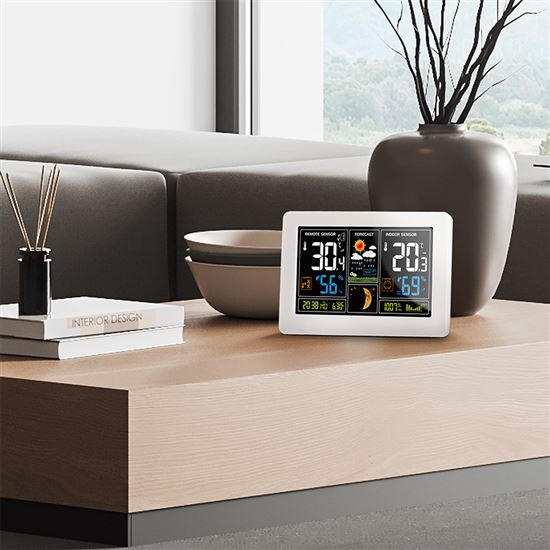 Tato meteostanice je ideálním řešením pro sledování počasí jak uvnitř, tak venku. Měří vnitřní teplotu v rozmezí 0°C až +50°C, venkovní teplotu od -20°C až +60°C, a vlhkost jak uvnitř (20% - 95%), tak venku. Dále měří atmosférický tlak (600 hPa/mb - 1100 hPa/mb) a poskytuje přesnou předpověď počasí ve 6 grafických úrovních. Umožňuje připojení až 3 bezdrátových senzorů s dosahem až 60 m ve volném prostoru a funkci cyklického přepínání mezi senzory. Meteostanice nabízí úsporný režim displeje s 5 úrovněmi podsvícení, což zajišťuje optimální čitelnost. Je vybavena rádiově řízeným časem, kalendářem, fázemi Měsíce a budíkem s možností odložení. Paměť minimálních a maximálních hodnot pro teplotu a vlhkost je automaticky uložena pro obě měřené oblasti, což vám umožňuje snadno sledovat historická data.Barevný podsvícený displej o velikosti 7,5" (17,0 x 9,4 cm) poskytuje rychlý a pohodlný přístup k ovládacím tlačítkům na boční hraně. Meteostanici lze pověsit na zeď nebo postavit na opěrný stojánek. Napájení zajišťuje adaptér AC 230V nebo DC 5V (součástí balení), a pro provoz jsou potřeba 2 x AA baterie pro hlavní jednotku a senzor.Tato stanice je praktickým a stylovým doplňkem pro každou domácnost nebo kancelář, který vám poskytne přesné a aktuální informace o počasí a pohodlí.