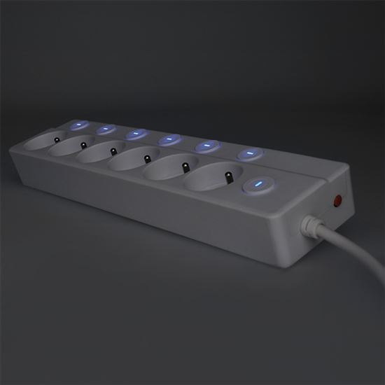 Individuální ovládání každé zásuvky Přívod s šesti zásuvkami a celkem sedmi vypínači nabízí maximální kontrolu nad připojenými zařízeními. Díky samostatným vypínačům šetříte nejen elektřinu, ale i životnost spotřebičů. Sedmý hlavní vypínač umožňuje odpojit všech pět zásuvek najednou. Decentní modré podsvícení signalizuje, která zásuvka je právě aktivní.