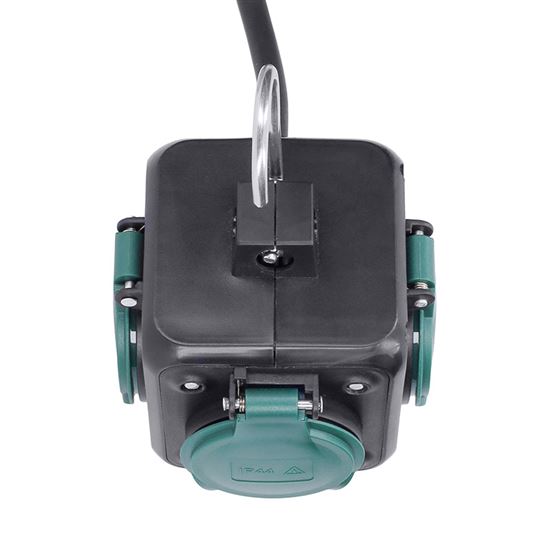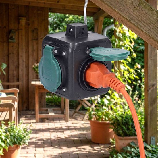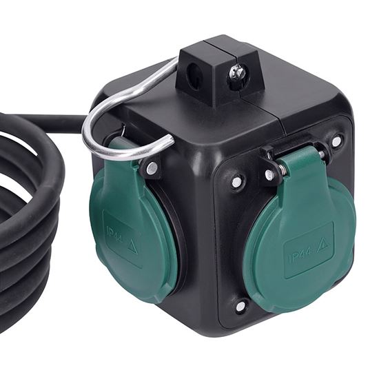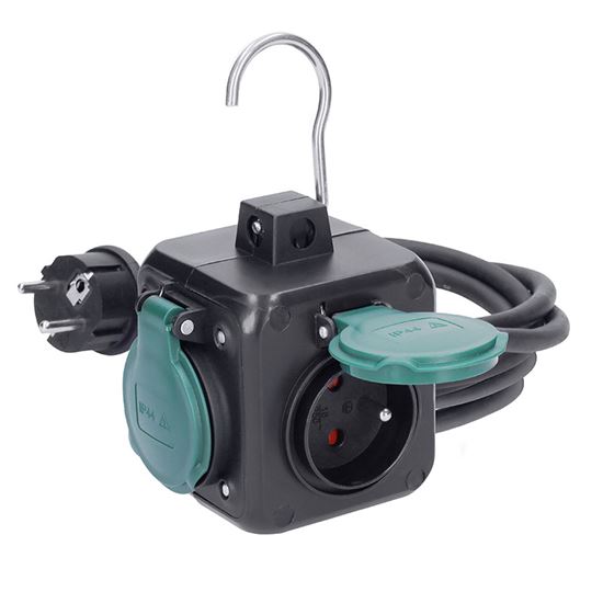Odolný pomocník pro venkovní použití Prodlužovací přívod s gumovým kabelem a třemi zásuvkami ve tvaru kostky je perfektní volbou pro práci na zahradě, stavbě nebo v dílně. Díky kovovému háčku je možné ho pověsit na jakékoli místo. Robustní konstrukce zajišťuje spolehlivý provoz a krytím IP44 zaručuje odolnost proti stříkající vodě ze všech směrů.
