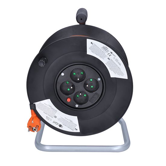 Přehledné uspořádání a snadná manipulace PVC kabel s vodiči o průřezu 3×1,5 mm2 je vhodný pro vnitřní a suché chráněné prostory. Buben je vybaven čtyřmi zásuvkami s dětskými pojistkami, navíc i tepelnou pojistkou, která přeruší napájení v případě přetížení nebo při použití bez úplného odvinutí kabelu. Barevné odlišení kabelu od okolního prostředí zvyšuje bezpečnost při práci.