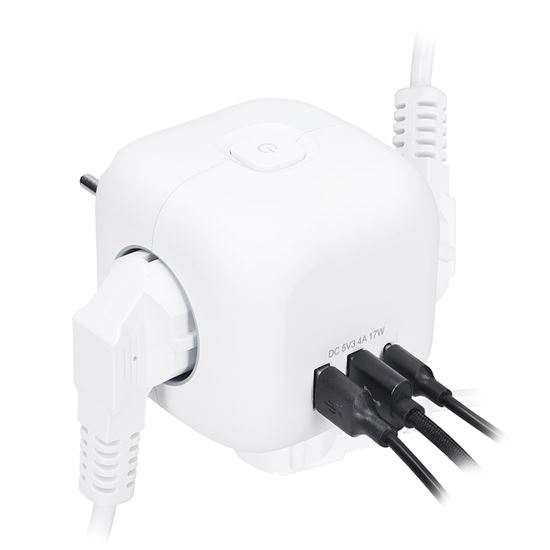 Chytré rozmístění a moderní design Promyšlené rozmístění zásuvek umožňuje snadné připojení různých přívodních šňůr i objemných napájecích adaptérů bez vzájemného překážení. Elegantní design kostky se zaoblenými hranami, bílým tělem a šedými zásuvkami se hodí do každého prostředí – ať už jde o kancelář, domácnost nebo pracovní dílnu.
