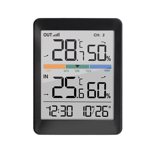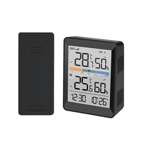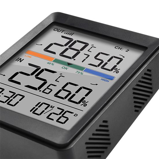 TeploměrDigitální teploměr a vlhkoměr s měřením vnitřní teploty (-9,9°C až +50°C) a venkovní teploty (-40°C až +70°C). Měření vlhkosti v interiéru i exteriéru (20% až 95%). Paměť minimálních a maximálních hodnot pro teplotu a vlhkost, indikátor vývoje teploty a vlhkosti. Funkce hodin, budíku a časového formátu 12/24, zobrazení teploty ve °C/°F. Součástí balení je 1 bezdrátový senzor s dosahem až 60 m (bez překážek). Napájení: hlavní jednotka 2x AAA baterie, senzor 2x AAA baterie (není součástí balení). Barva: černá.