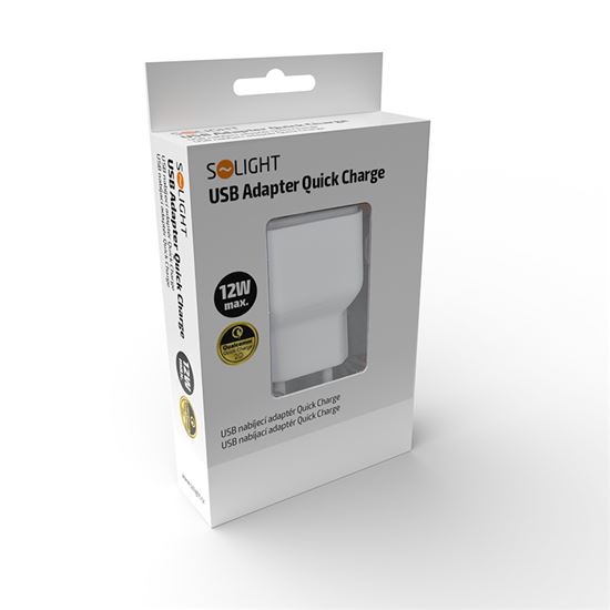 • Solight USB nabíjecí adaptér, fast charge: 1x USB Qualcomm, 5V2A/9V1.5A/12V1A, AC 230V, bílošedý