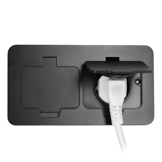 Vrchní kryt zásuvky je vyroben z odolné zinkové slitiny, která zajišťuje pevnost a zároveň ochranu proti korozi. Na povrchu nejsou viditelné žádné šrouby – montážní otvory zůstávají skryté pod každým víčkem. Díky tomu působí zásuvka elegantně a profesionálně a zároveň se snadno čistí.
