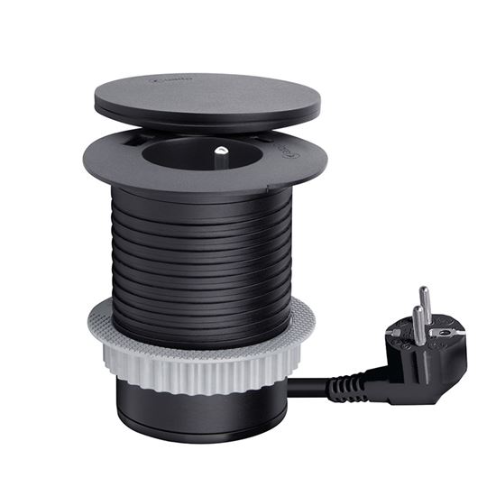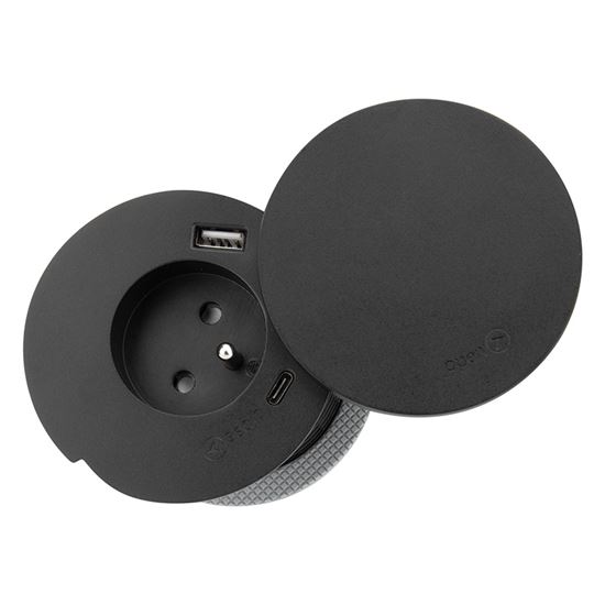 Zásuvka se instaluje do výřezu v desce stolu a fixuje pomocí šroubovacího mechanismu. Víčko stačí otočit a odkryje nebo se zakryje napájecí modul. Pracovní plocha zůstává čistá a síťová zásuvka i USB porty jsou chráněné proti prachu nebo drobným nečistotám.